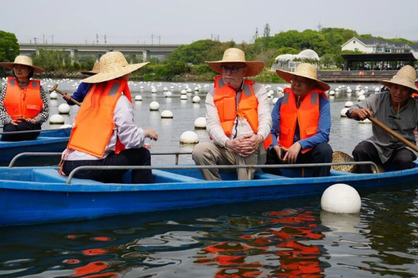 2025年4月11日,閔慶文(右二)陪同國際專家考察浙江德清淡水珍珠復合養殖系統。