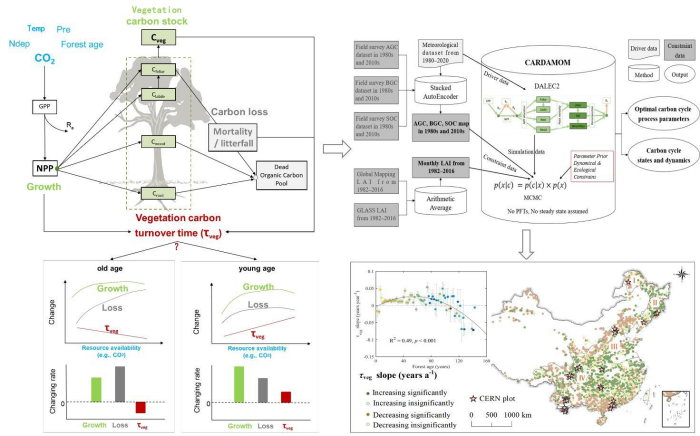 植被碳周轉(zhuǎn)時間(τveg)是主導(dǎo)陸地碳循環(huán)動態(tài)不確定性的關(guān)鍵參數(shù)。已有研究表明,北美與歐洲的成熟或原始森林τveg在全球氣候變化下因碳損失加速而呈現(xiàn)縮短趨勢。然而,在全球廣泛分布的、具有不同生長模式的年輕森林中,τveg的時間變化趨勢尚不明確。國家生態(tài)科學(xué)數(shù)據(jù)中心整合長期、多源的觀測數(shù)據(jù),綜合運用耦合深度學(xué)習(xí)的數(shù)據(jù)同化、聯(lián)網(wǎng)觀測和多模式模擬手段,并結(jié)合動態(tài)非平衡理論,首次在中國區(qū)域尺度上揭示了中國森林τveg的長期變化趨勢,更新修正了“全球森林τveg持續(xù)縮短”的普遍認知。