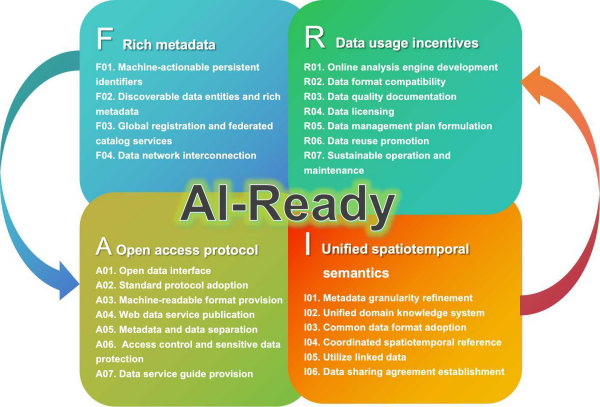 FAIR原則(可發(fā)現(xiàn)、可訪問、可互操作、可重用)自2016年提出以來,已成為多學科數(shù)據(jù)治理的重要指導框架。然而,在地球科學領(lǐng)域,其實踐仍面臨固有挑戰(zhàn):數(shù)據(jù)來源多樣、格式繁雜、標準不一;研究跨越從瞬時觀測到百萬年地質(zhì)記錄的極大時空尺度;數(shù)據(jù)語義豐富且空間異質(zhì)性強,卻缺乏統(tǒng)一術(shù)語體系;全球超1200個地學數(shù)據(jù)庫高度集中在歐美發(fā)達國家,地理分布極不均衡。人工智能(AI)時代的到來對AI就緒數(shù)據(jù)(AI-Ready Data)提出了迫切需求。為填補這一方法空白,中國科學院地理科學與資源研究所王卷樂研究員聯(lián)合多家單位多位專家,在數(shù)據(jù)治理層面系統(tǒng)性地提出了面向地球科學數(shù)據(jù)的24項FAIR實施建議,為科學數(shù)據(jù)治理與AI驅(qū)動科學范式轉(zhuǎn)型提供了具體的方法論參考。