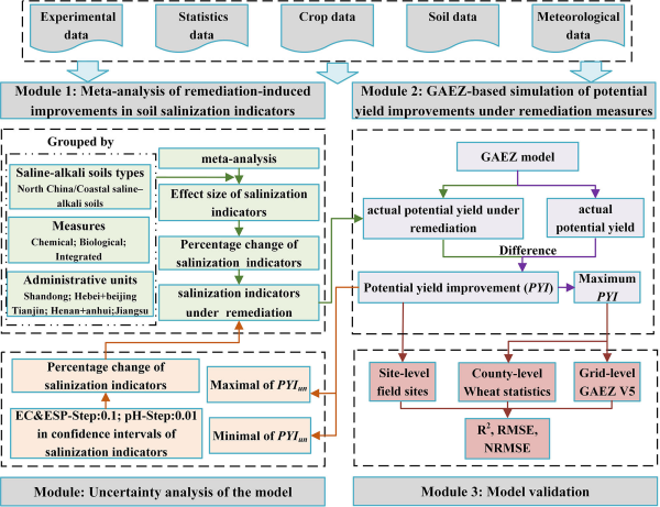 近日,史文嬌課題組在《Agricultural Systems》發表文章,系統構建了鹽堿地改良后,小麥潛在產量提升的空間評估框架。該研究以我國黃淮海區為例,將評估作物潛在產量的全球農業生態區劃(GAEZ)模型與改良后土壤鹽堿指標變化的實驗數據進行耦合,實現了區域尺度鹽堿地改良產能提升潛力的空間精細尺度量化評估。