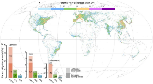 圖 1. 全球建筑立面光伏潛力空間分布及不同情景下的碳減排潛力